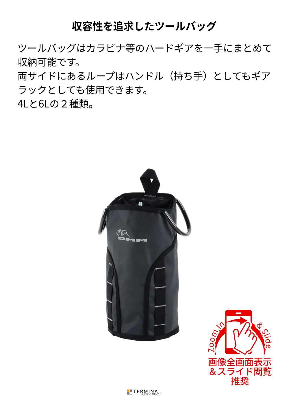ツールバッグはカラビナ等のハードギアを一手にまとめて収納可能です。両サイドにあるループはギアラックとハンドキャリーを兼 用しています。