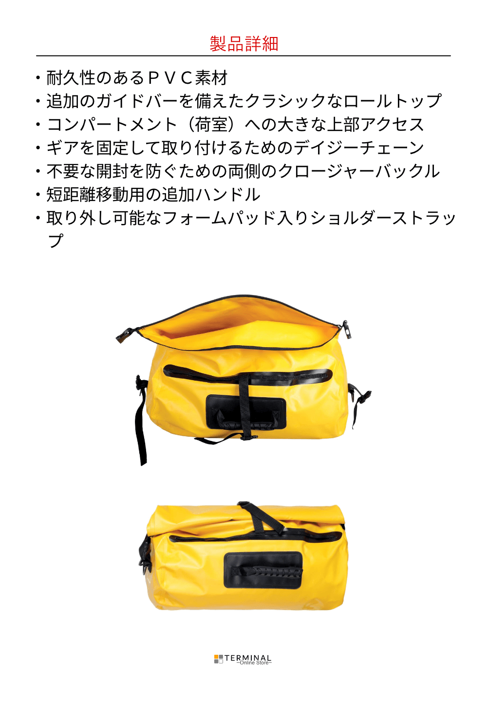 防水性と耐久性に優れたPVC製。縫い目はシーム 加工済み。ロールトップによる耐水仕様です。