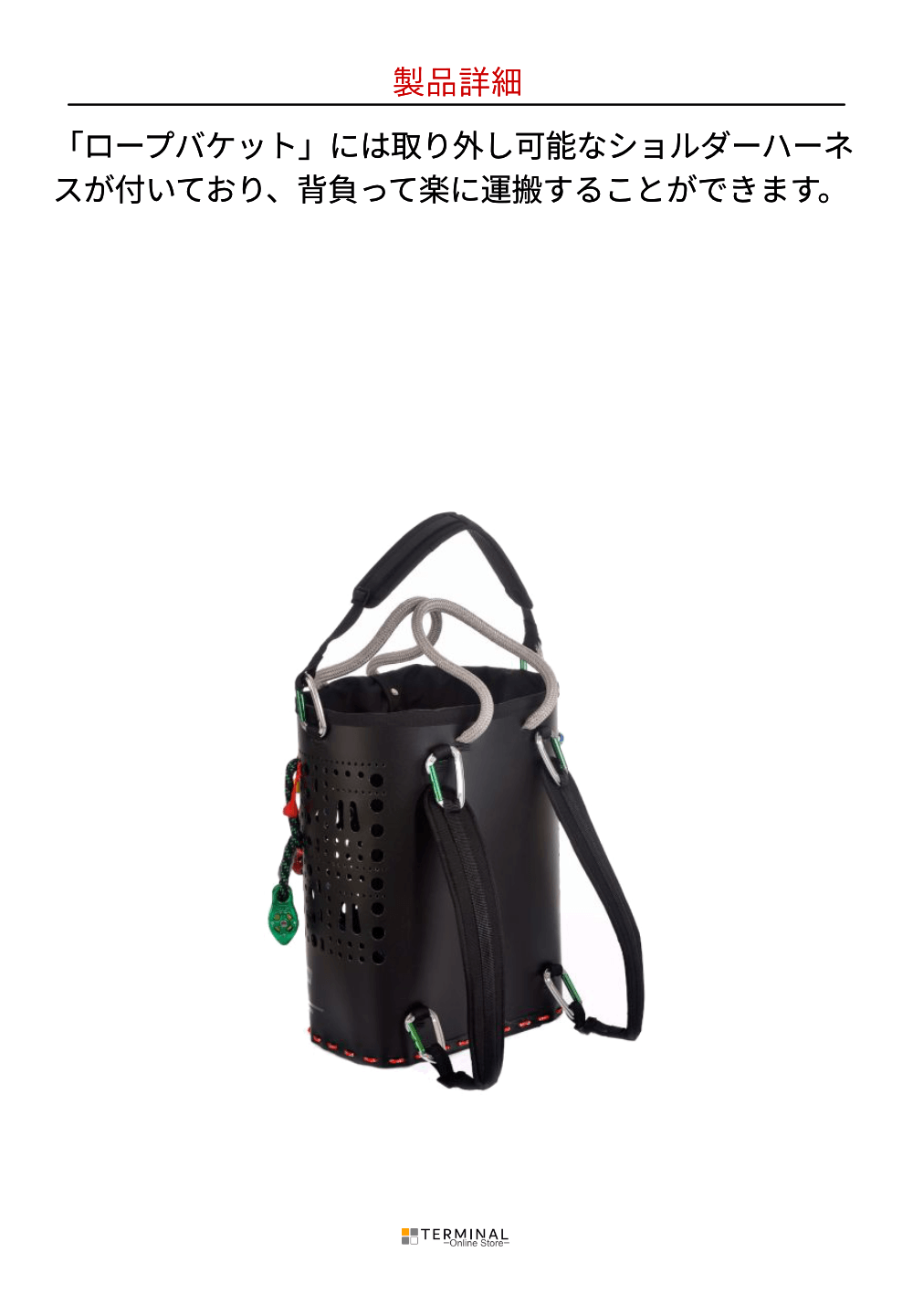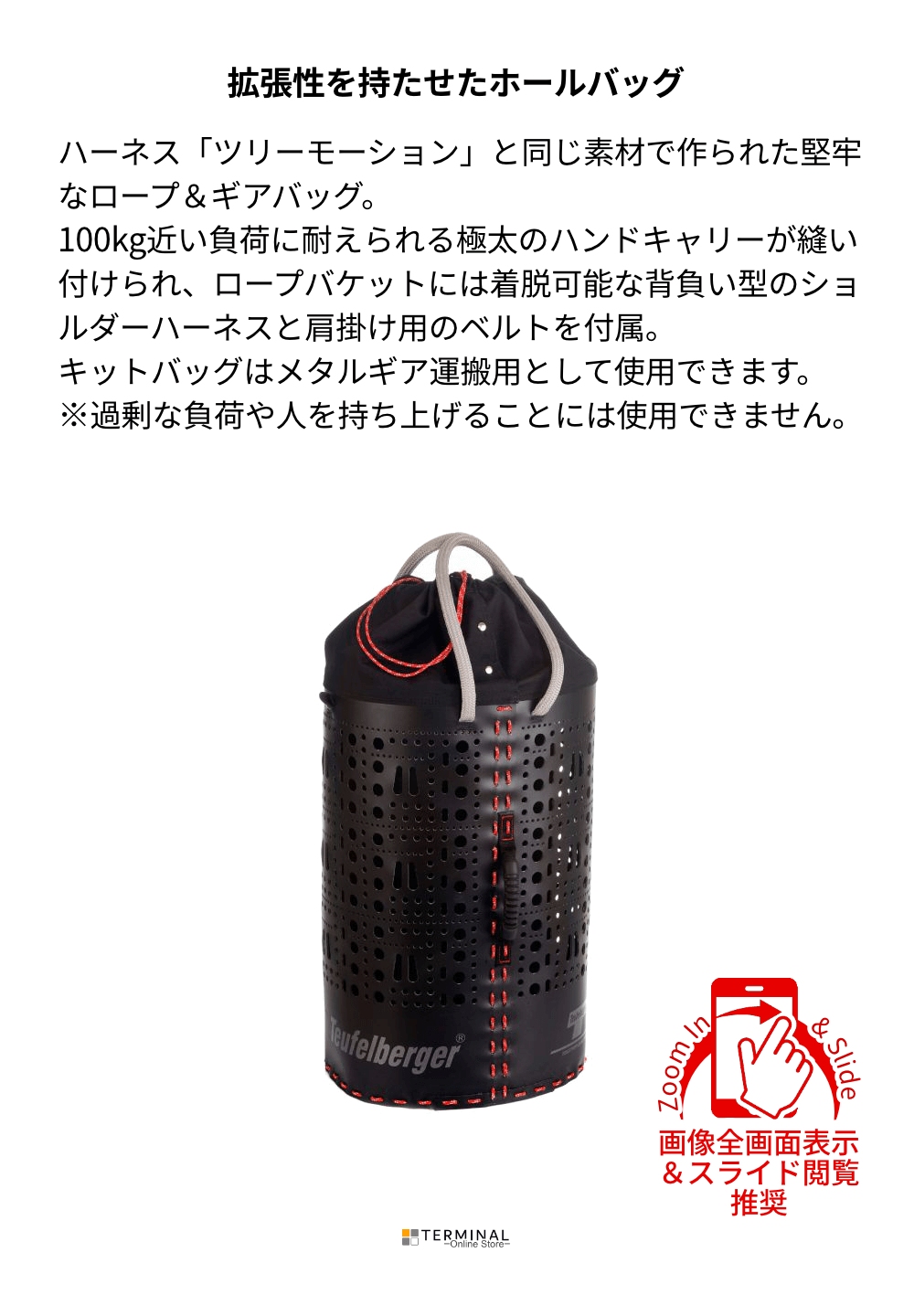 ツリーモーションと同じ素材で作られた堅牢なロープ&ギアバッグ。100kg近くの 負荷に耐えられる極太のハンドキャリーが縫い付けられ、ロープバケットには着脱 可能な背負い型のショルダーハーネスと肩掛け用のベルトを付属。キットバッグは メタルギア運搬用として使用できます。好みの位置にギアをキープできるホールが 無数に設けられています。自由にアレンジができるカスタマイズ用ギアループ付属。