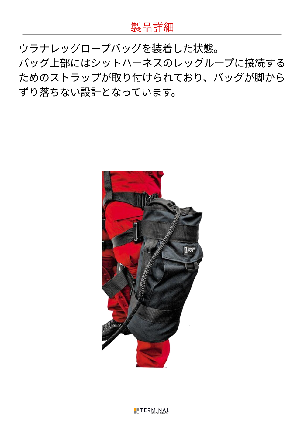 ハーネスとユーザーの脚に取り付て使用するロープバッグ。特殊作業などでロープを下方へ垂らしたくないシチュエーションなどに有効です。11mm×30m程度のロープを収納可能。