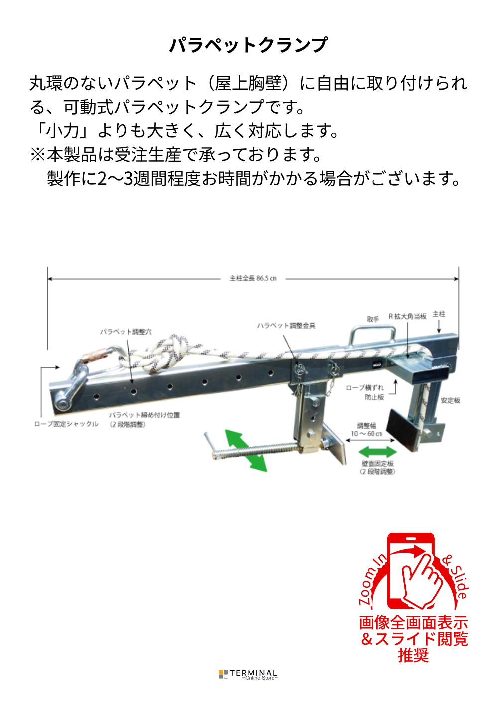 丸環のないパラペット(屋上胸壁)に自由に取り付けられる、可動式パラペットクランプです。