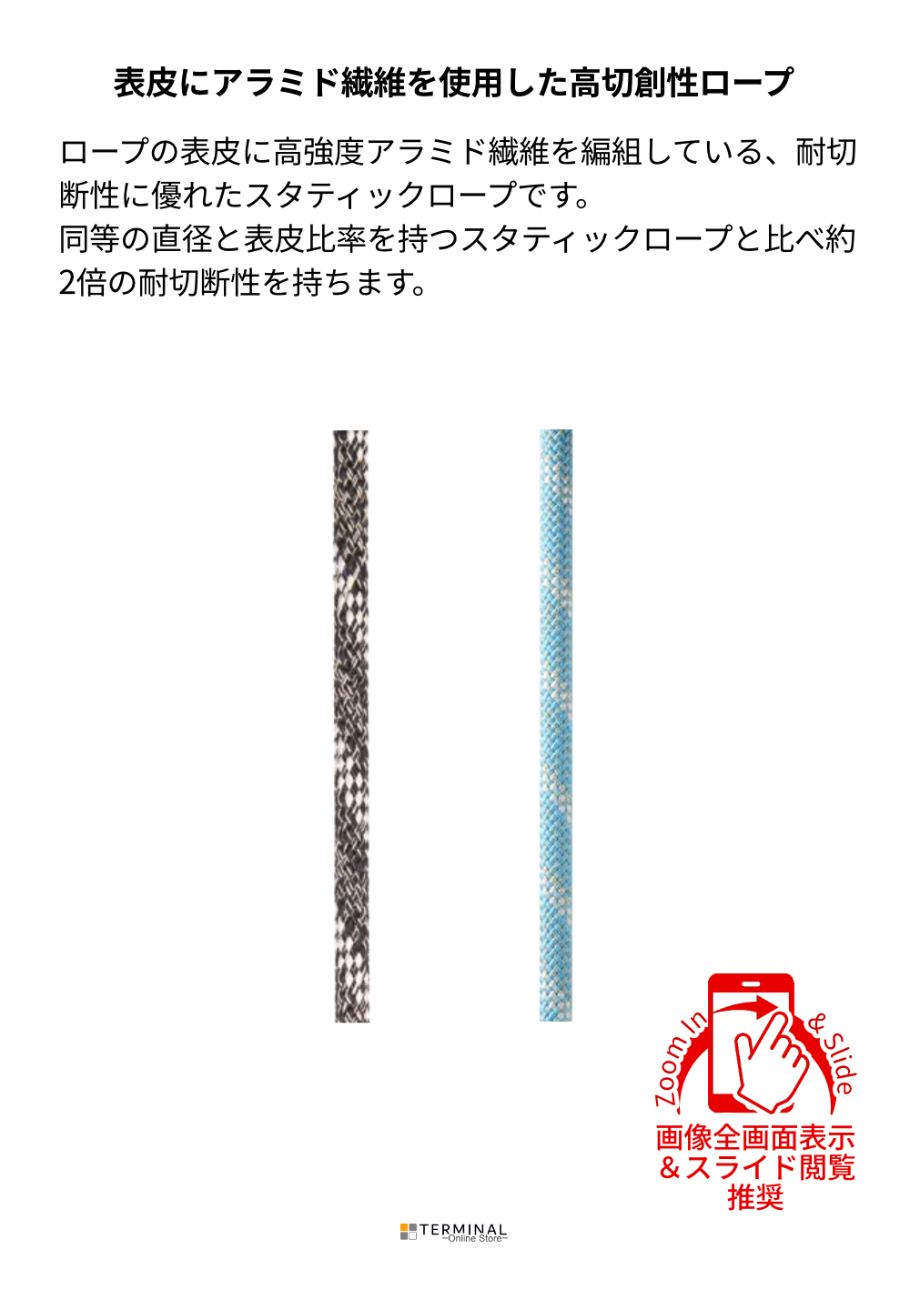 ・ロープの外皮にアラミド繊維を編み込むことにより、切断に対する耐性を強化