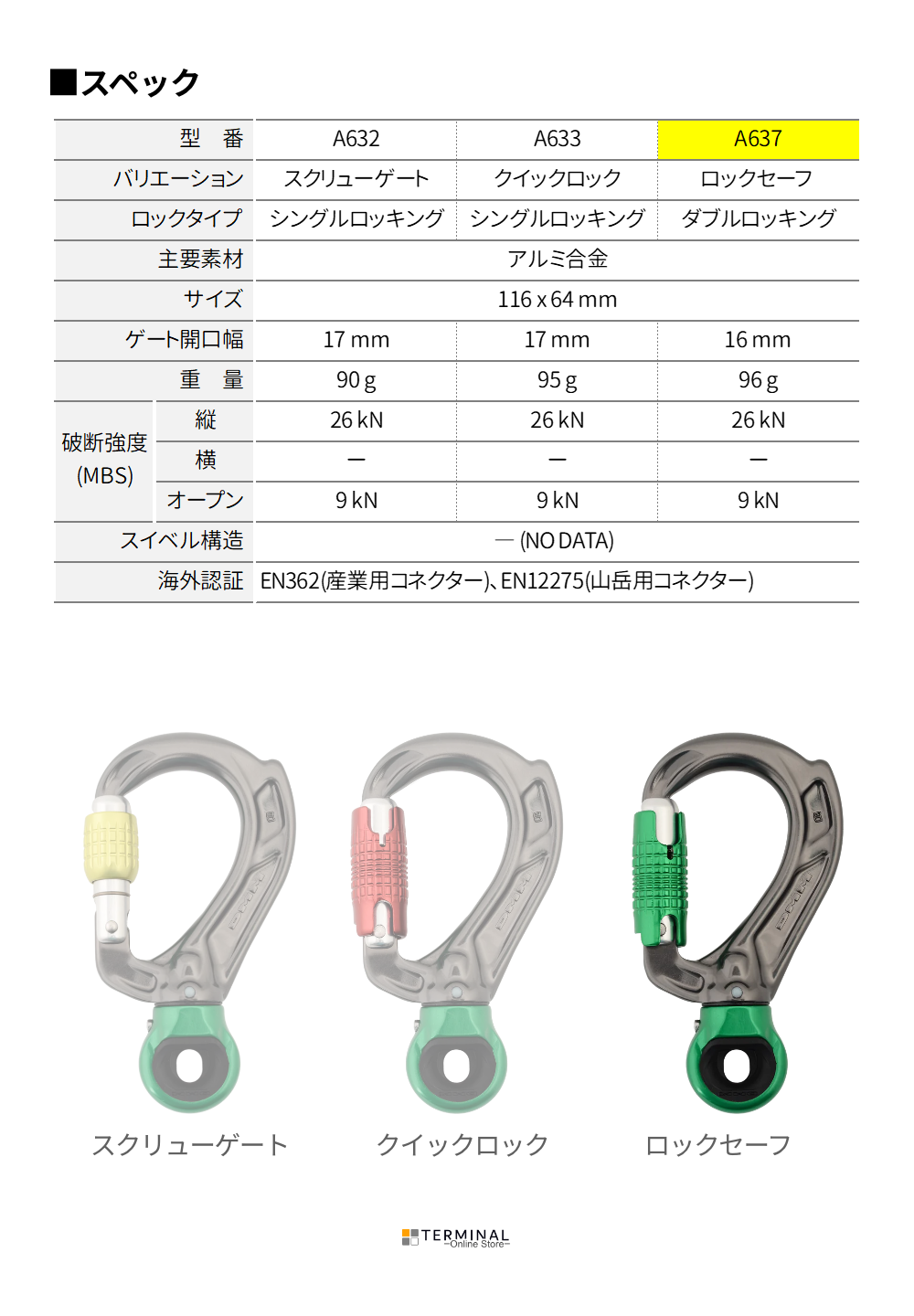 スクリューゲート | 90 g | 17 mm | 26 kN | - | 9 kN |