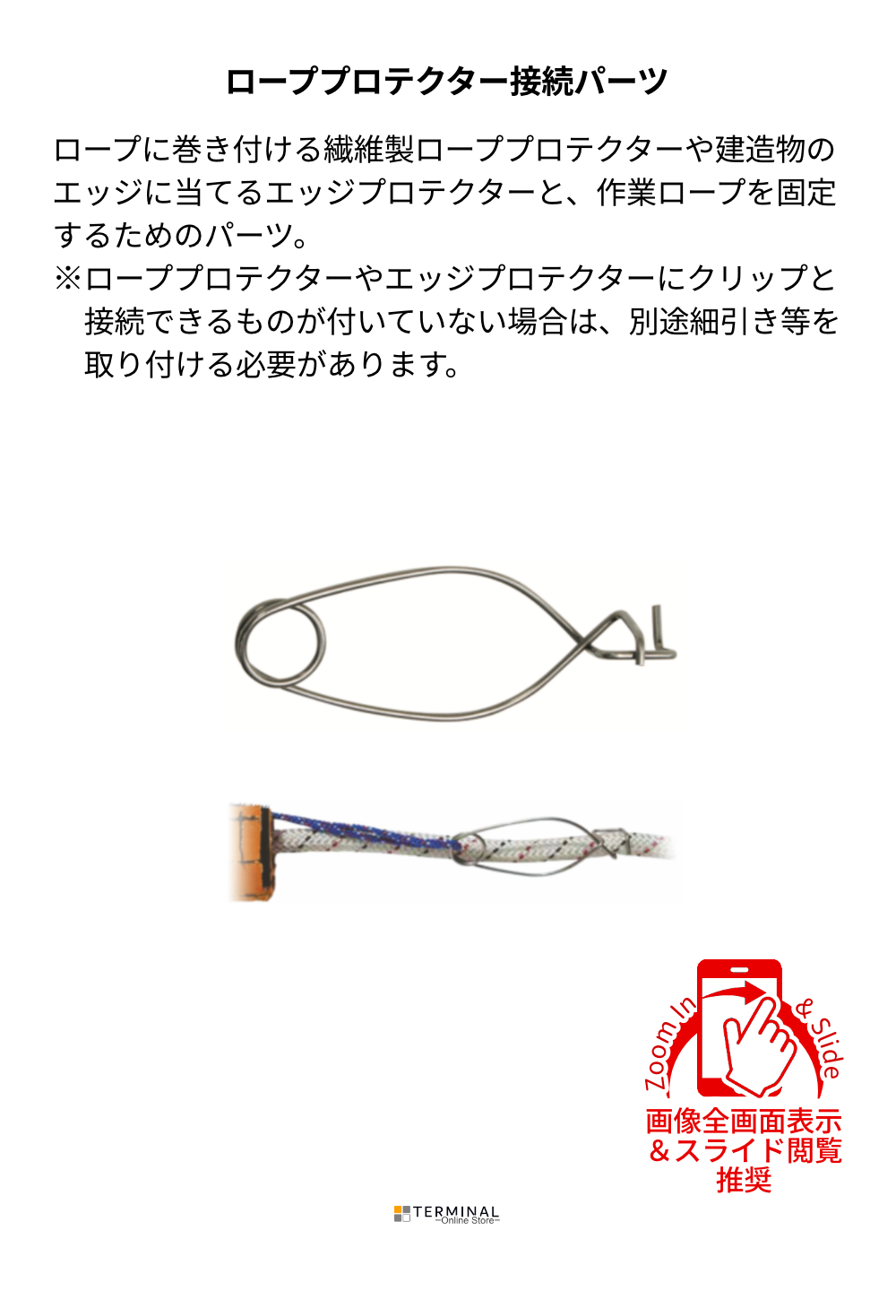 ローププロテクターとロープを固定するためのクリップ。汎用タイプで、他社製のローププロテクターで取付用の紐やストラップがある製品であれば使用できます。