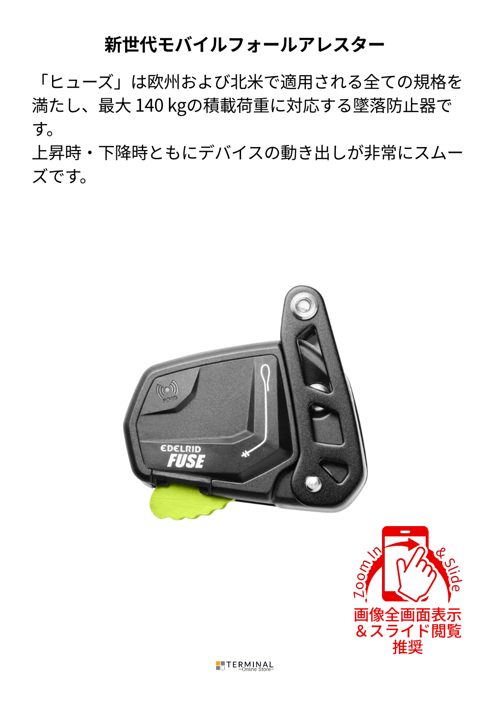 ヒューズは欧州および北米で適用される全ての規格を満たし、最大140kgの積載荷重に対応する墜落防止器です。上昇時・下降時ともにデバイスの動き出しが非常にスムーズです。ロープのクランプ機構とアクティベータの分離(特許出願済み)により、デバイスの信頼性と安全性が向上します。クランプカムは波型形状であるため、ロープの摩耗軽減と破れを防ぎ、完全に除荷せずにロックしたカムを解除できます。必要に応じてロック機能を使用することで、クランプをアクティブにした状態で作業が可能です。ロープへセットする際は、カラビナからロープを外すことなく行えます。軽量でコンパクトなエネルギーアブソーバーのデフューザーと組合わせることで、最大衝撃力は標準より30%程度低くなります。用途に応じたアブソーバーとの組合わせで、最適なハンドリングが可能です。