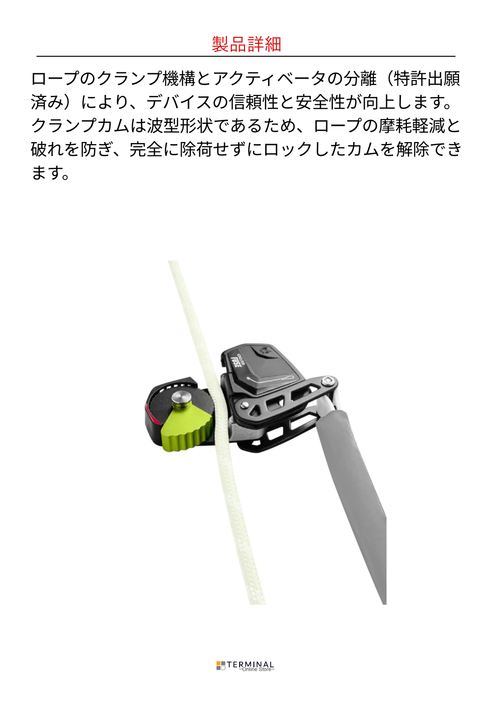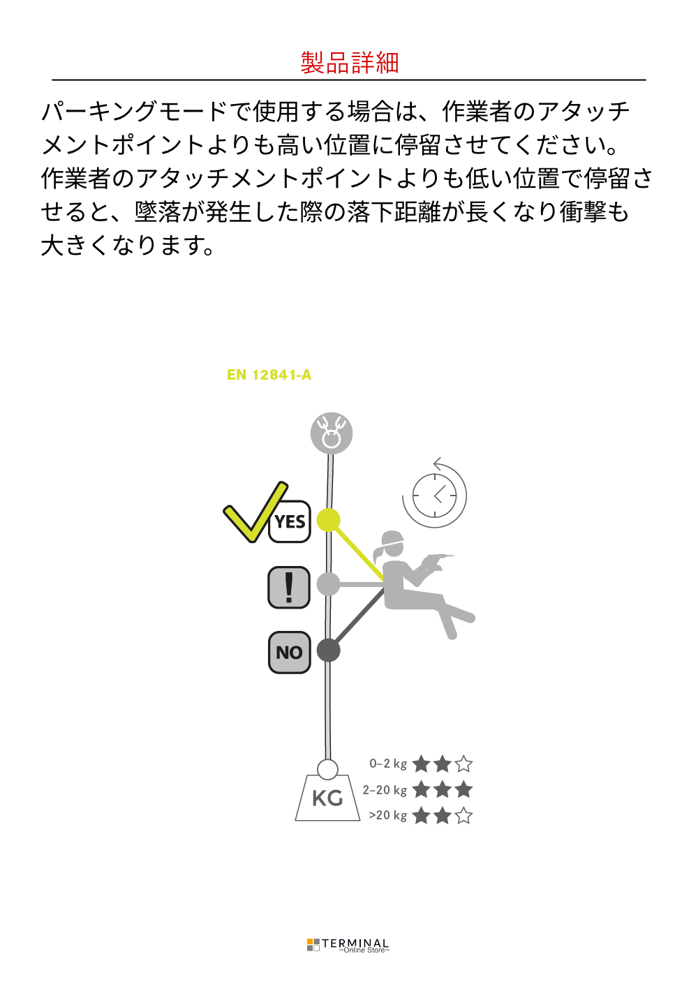 - アレスト機能により、作業位置でのビレイをピンと張りやすくし、風にさらされたときのロープのたるみを防ぎます。