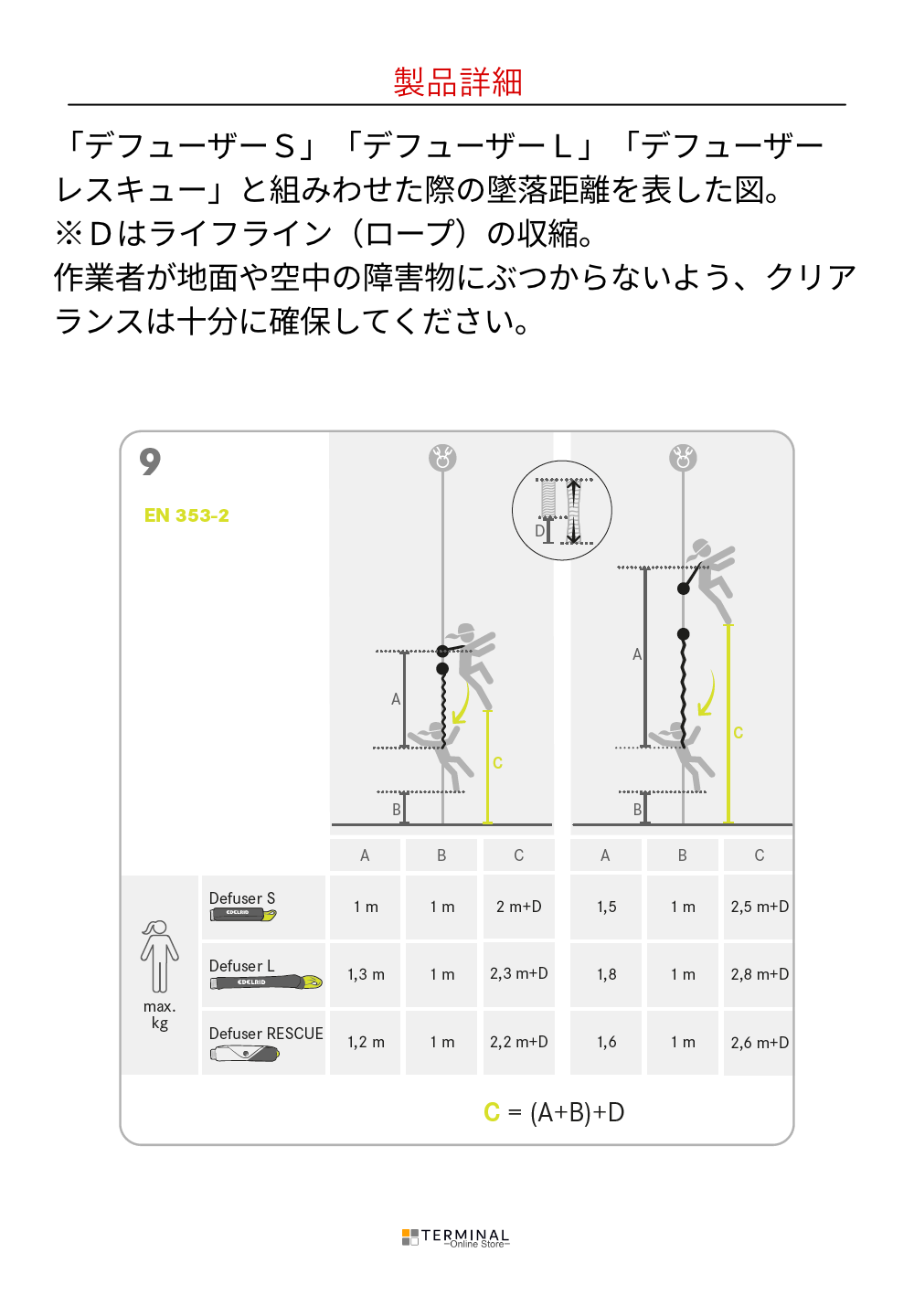 - DEFUSER エネルギー吸収材の使用により、逮捕時の衝撃が標準より 30 % 低減されます。