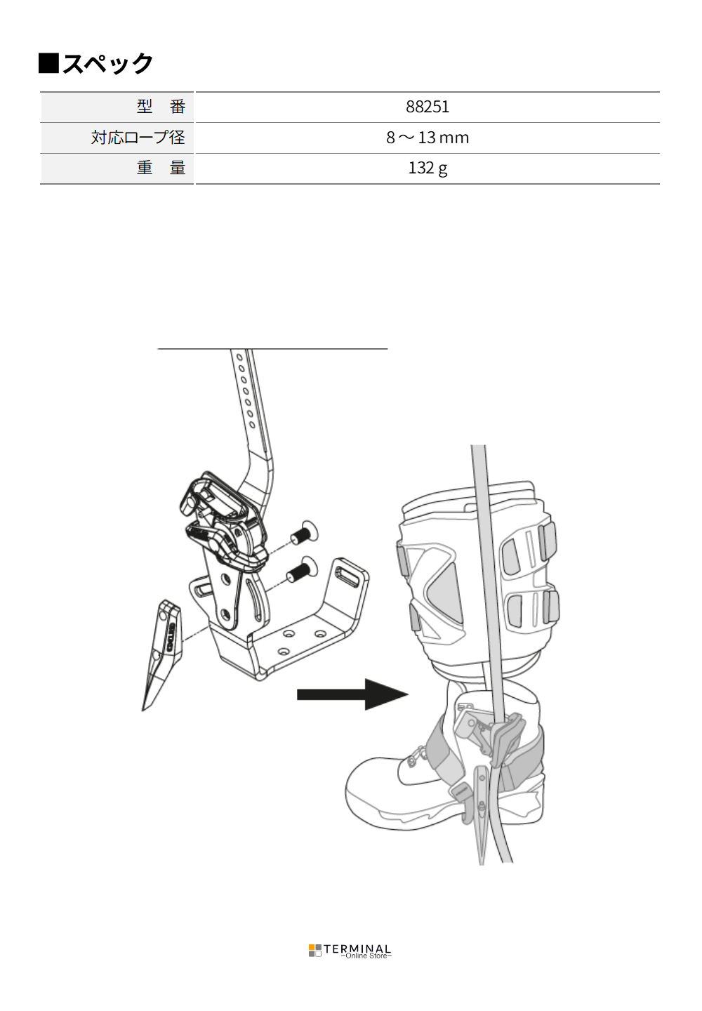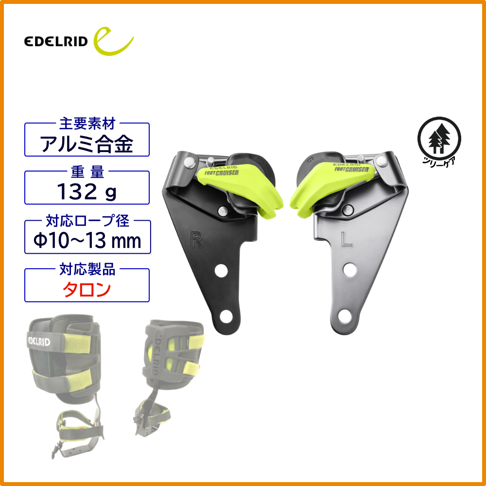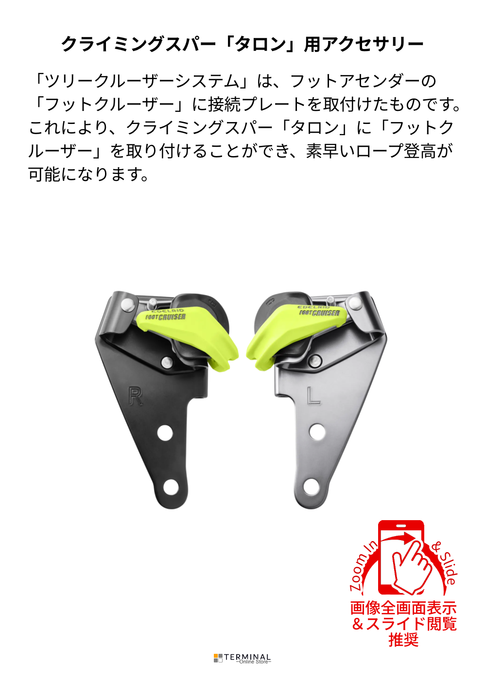 ツリークルーザーシステムは、フットアセンダーのフットクルーザーに接続プレートを取 付けたものです。これにより、タロンツリーアイゼンにフットクルーザーを取付けること ができます。