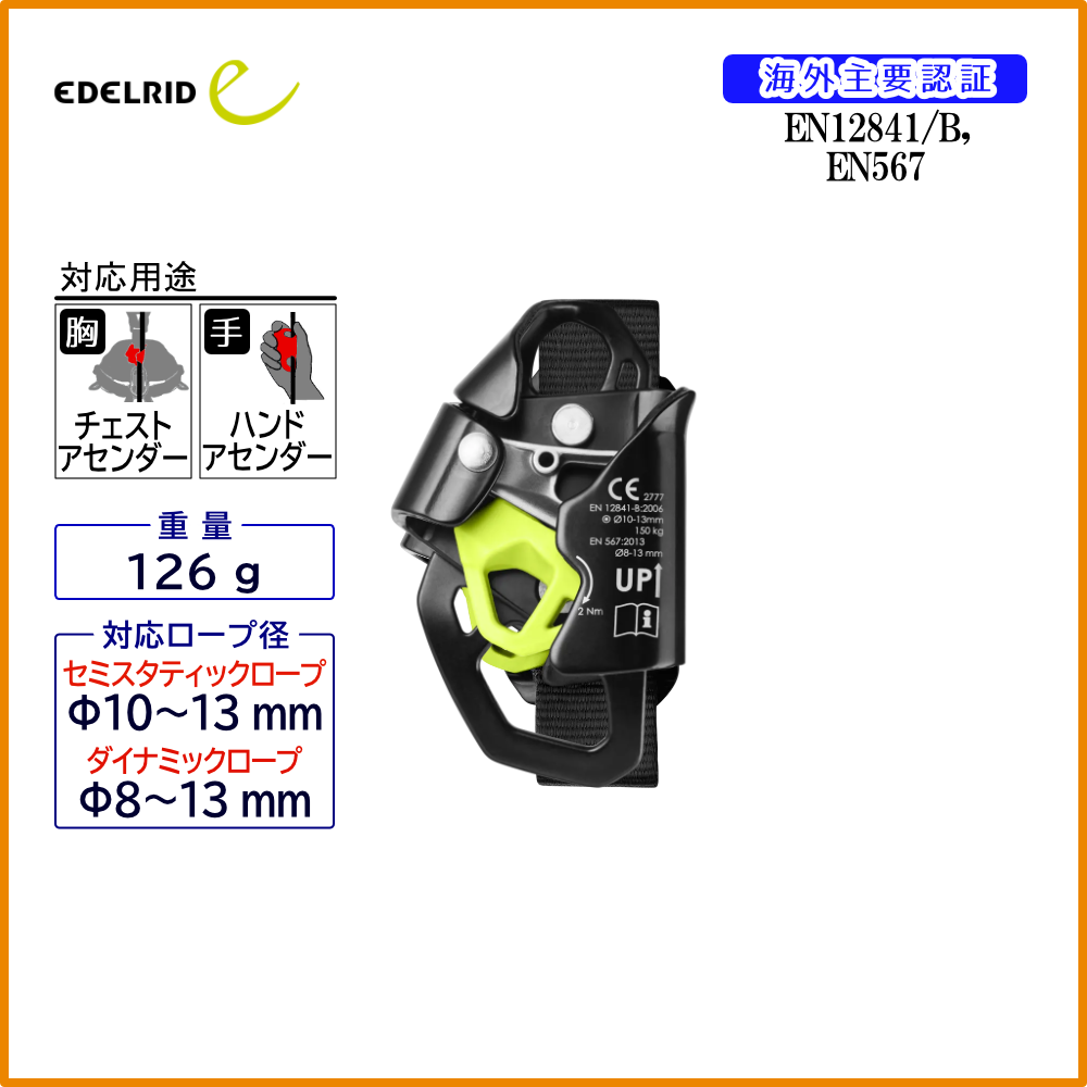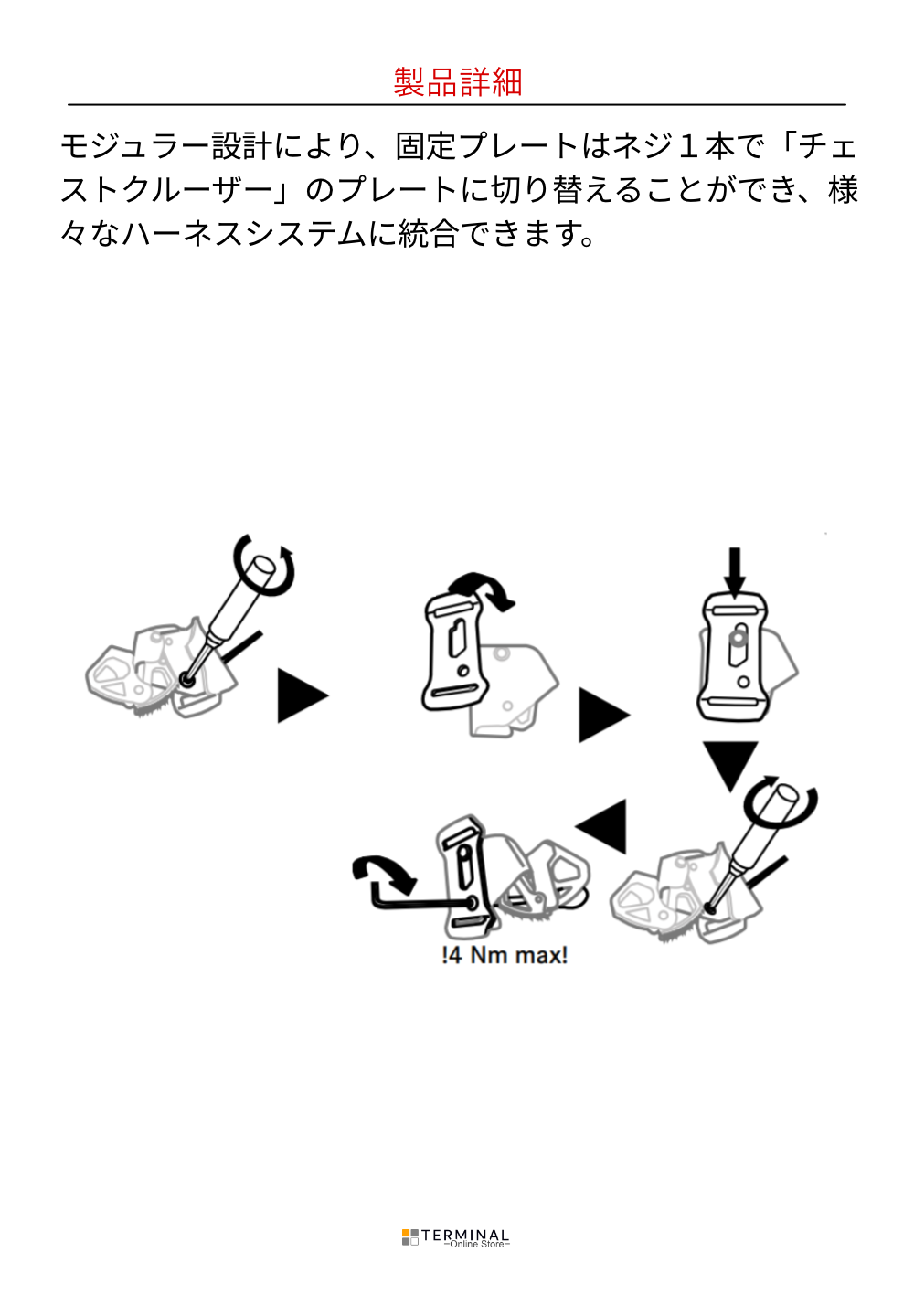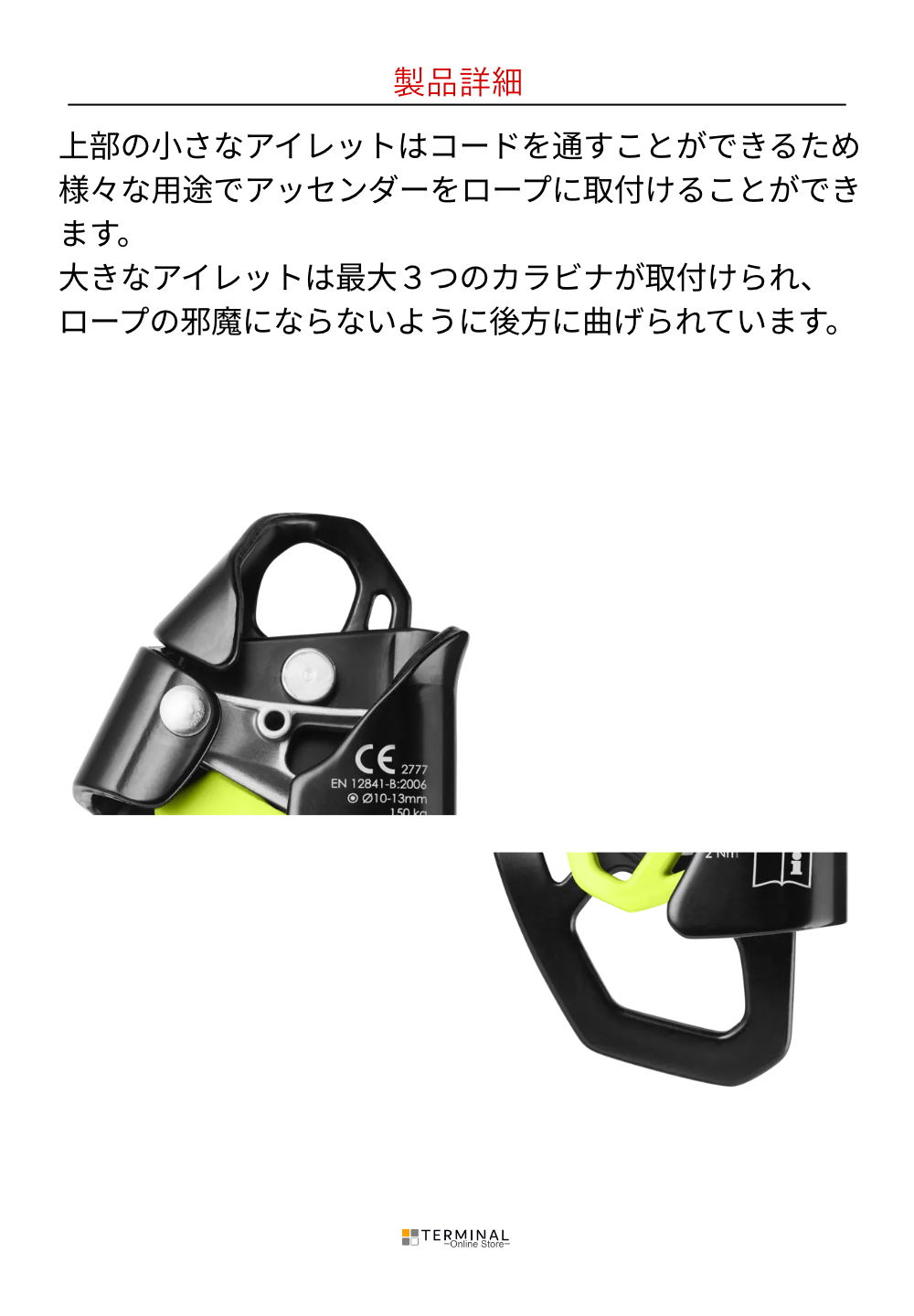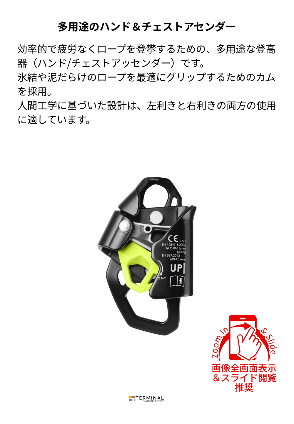 効率的で疲労なくロープを登攀するための、多用途な登高器(ハンド / チェストアッセン ダー)です。人間工学に基づいた設計は、左利きと右利きの両方の使用に適しています。 モジュラー設計のおかげで、固定プレートはネジ1本でチェストクルーザーのプレートに 切り替えることができ、さまざまなハーネスシステムに統合できます。上部の小さなアイ レットはコードを通すことができるため、さまざまな用途でアッセンダーをロープに取付 けることができます。大きなアイレットは最大3つのカラビナが取付けられ、ロープの邪 魔にならないように後方に曲げられています。
