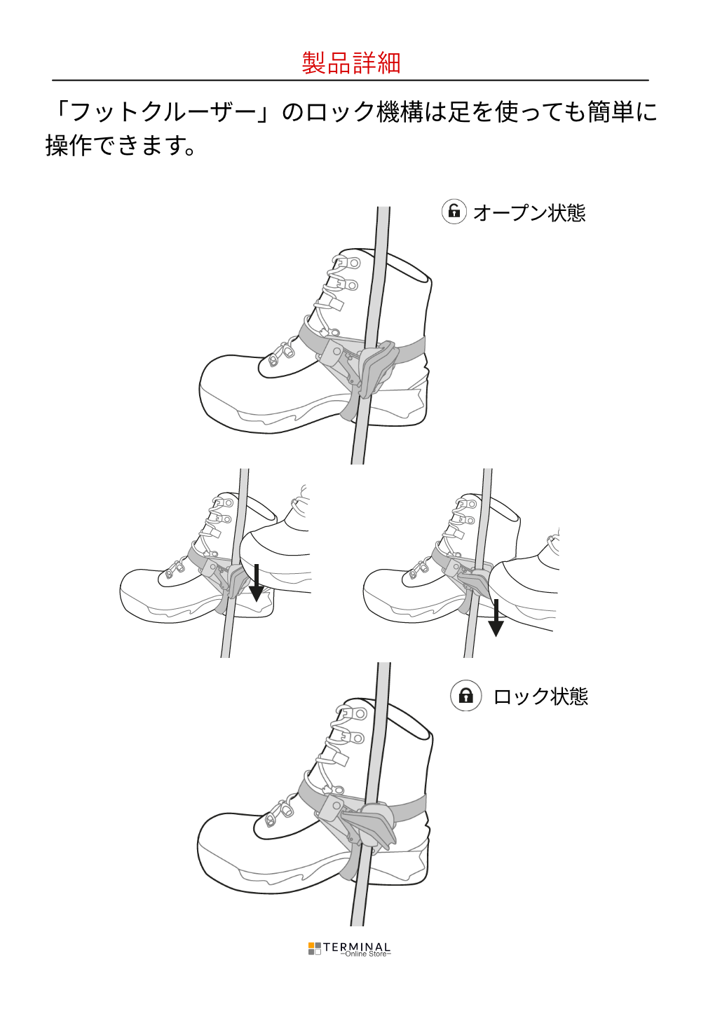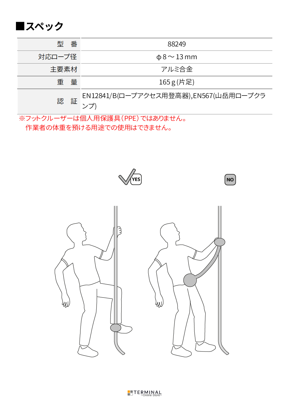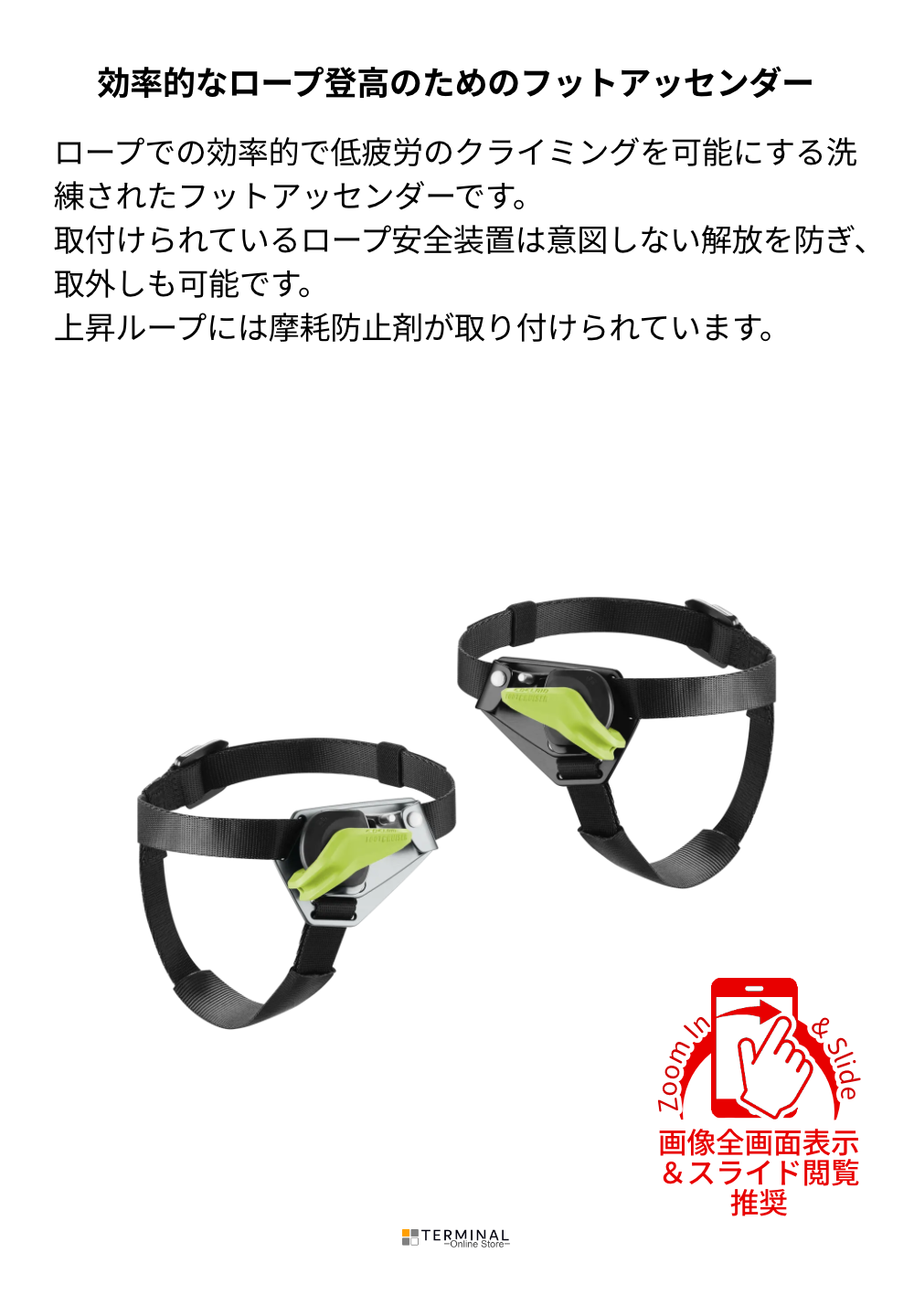 ロープでの効率的で低疲労のクライミングを可能にする洗練されたフットアッセンダーで す。取付けられているロープ安全装置は意図しない解放を防ぎ、取外しも可能です。フッ トクルーザーのロック機構は、足を使っても簡単に操作できます。上昇ループには摩耗防 止剤が取り付けられています。