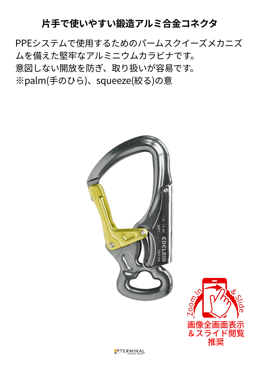 PPE システムで使用するためのパームスクイーズメカニズムを備えた堅牢なアルミニウ ムカラビナです。